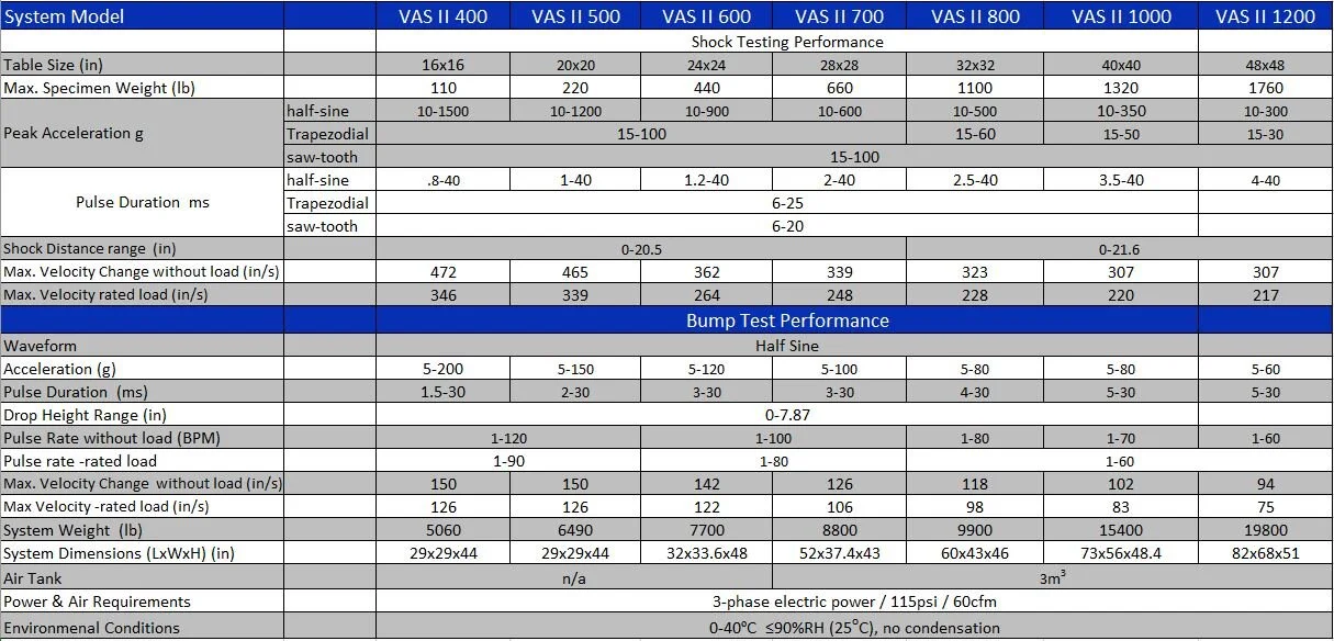 VAS II series pneumatic shock and collision test system has a high degree of automation and can be used for the shock test of conventional half-sine wave, postpeak sawtooth wave, and trapezoidal wave etc. The easy-to-use designed shock testing equipment is easy to operate and it is used to test product’s ability to withstand the shock of destruction in actual use, in this way we can evaluate the product’s adaptability to the shock environment and optimize the product structure strength according to the experimental data. We believe the excellent evaluation of product’s ability against shock can efficiently improve the reliability of product in use.